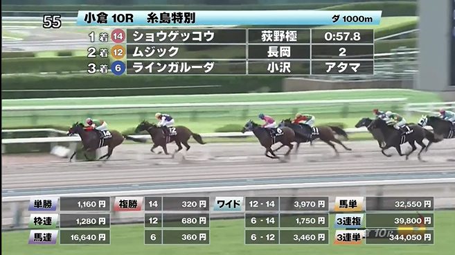 ◎ショウゲッコウ(6人気)1着 単勝1,160円、複勝320円