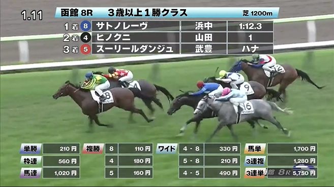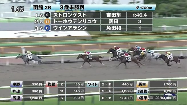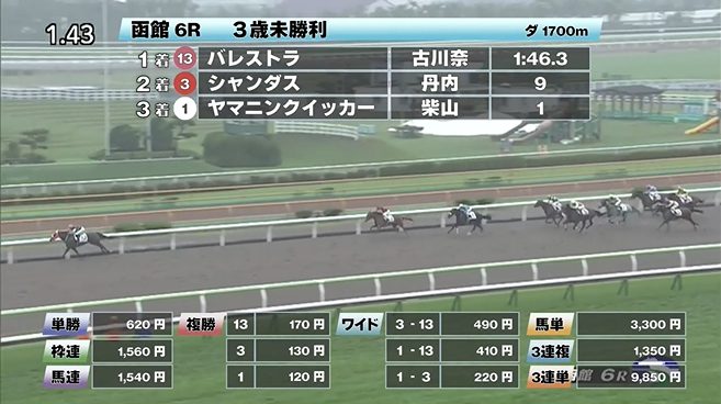 ◎バレストラ(3人気)1着 単勝620円、複勝170円 - 7/16【函館8R】3歳以上1勝クラス