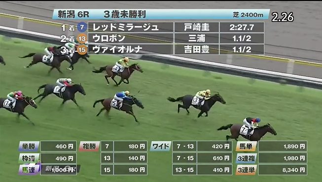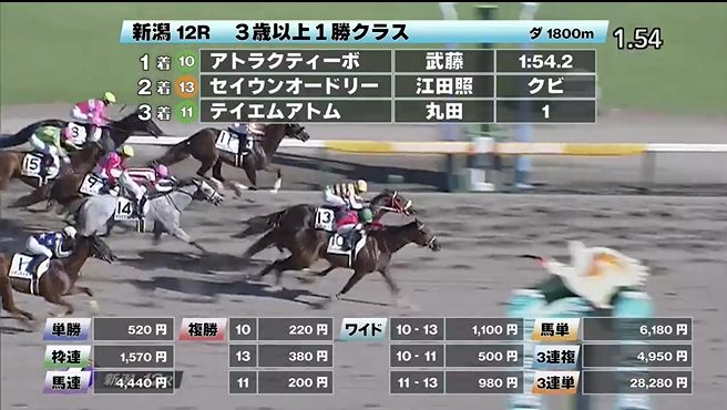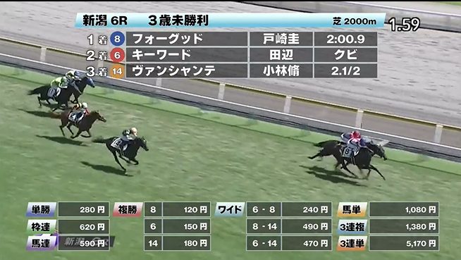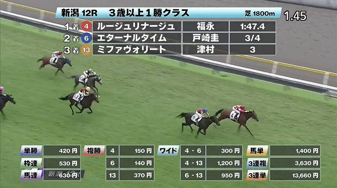 ◎フジフォンテ(6人気)1着 単勝1,340円、複勝270円 - 8/13【新潟8R】3歳以上1勝クラス
