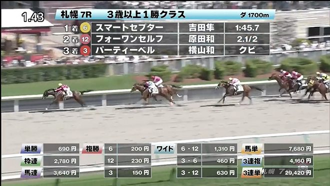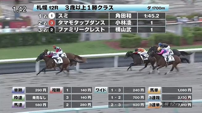 ◎スズカマジェスタ(7人気)1着 単勝1,470円、複勝390円 - 8/7【札幌9R】ライラック賞