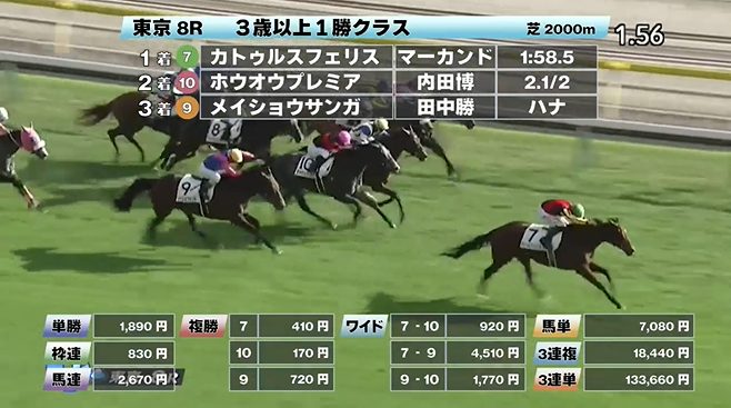 ◎シンリョクカ(4人気)1着 単勝820円、複勝230円 - 10/10【東京6R】2歳新馬