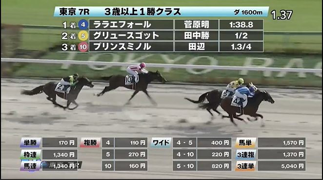 ◎シルトホルン(4人気)1着 単勝580円、複勝200円 - 10/16【東京6R】3歳以上1勝クラス
