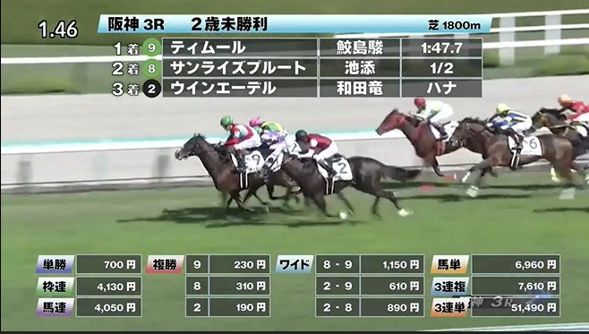 ◎ティムール(3人気)1着 単勝700円、複勝230円 - 10/29【阪神4R】2歳新馬