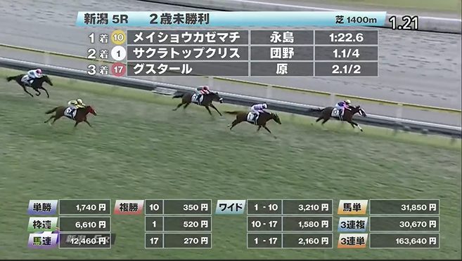 ◎バンブーグローブ(3人気)1着 単勝650円、複勝210円 - 10/23【新潟7R】3歳以上1勝クラス