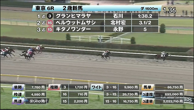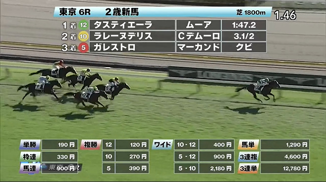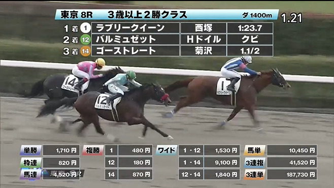 ◎ニシノライコウ(6人気)1着 単勝3,020円、複勝440円 - 11/12【東京4R】2歳新馬