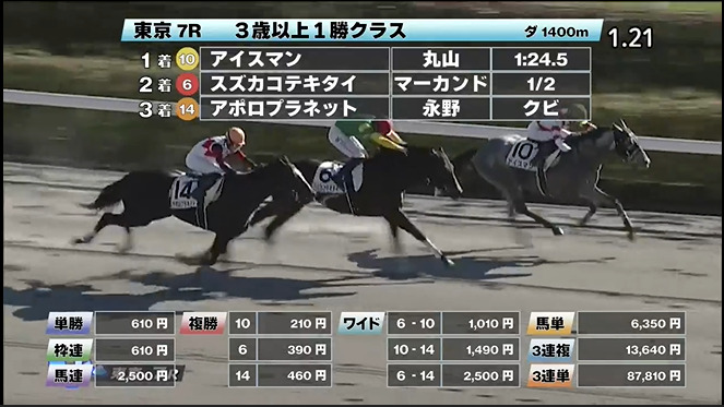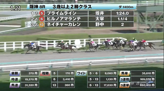 ◎タイセイランナー(6人気)1着 単勝1,100円、複勝320円