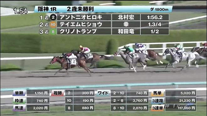 ◎アントニオヒロキ(6人気)1着 単勝1,150円、複勝300円 - 11/27【阪神2R】2歳未勝利
