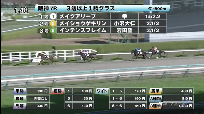 ◎メイクアリープ(5人気)2着 複勝250円 - 11/6【阪神9R】もちの木賞