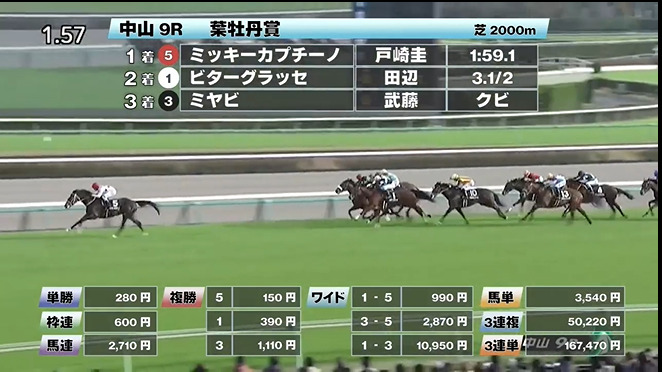 ◎ミッキーメテオ(6人気)1着 単勝1,000円、複勝300円 - 12/3【中山9R】葉牡丹賞