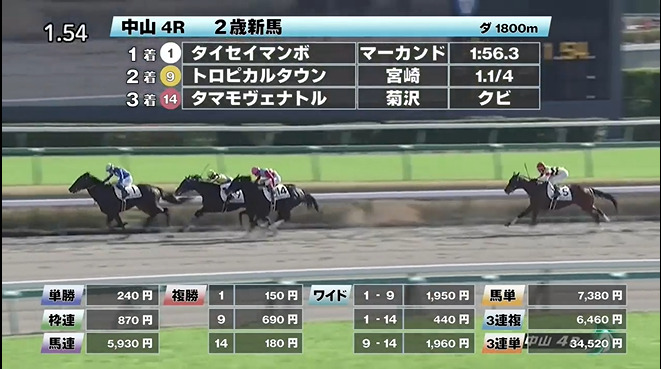 ◎タマモヴェナトル(2人気)3着 複勝180円 - 12/4【中山6R】2歳1勝クラス