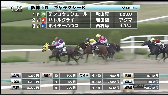 ◎デンコウリジエール(5人気)1着 単勝1,270円、複勝300円 - 12/4【阪神12R】3歳以上2勝クラス