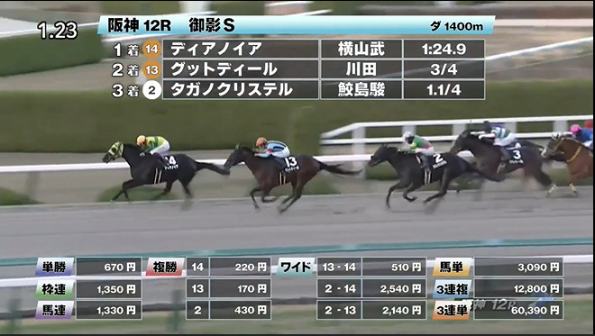 ◎ディアノイア(4人気)1着 単勝670円、複勝220円