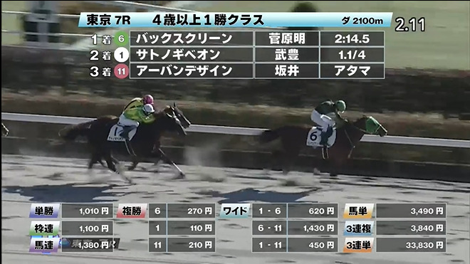 ◎バックスクリーン(5人気)1着 単勝1,010円、複勝270円 - 1/29【東京12R】4歳以上2勝クラス