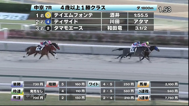 ◎テイエムフォンテ(4人気)1着 単勝730円、複勝160円