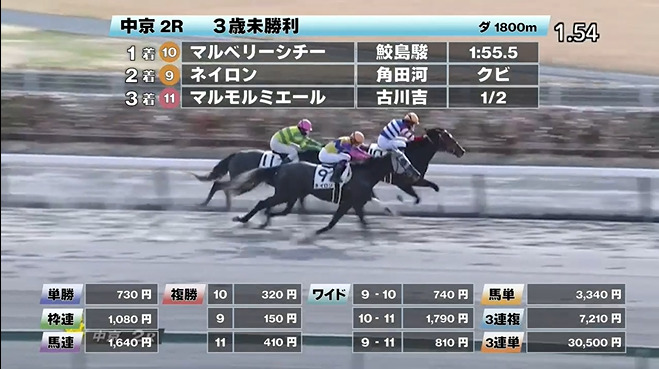 ◎マルベリーシチー(4人気)1着 単勝730円、複勝320円 - 1/29【中京4R】3歳1勝クラス