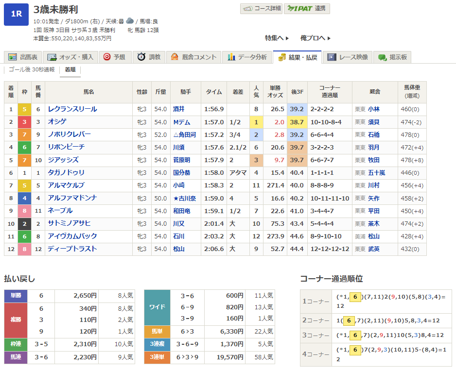 ◎レクランスリール(8人気)1着 単勝2,650円、複勝340円