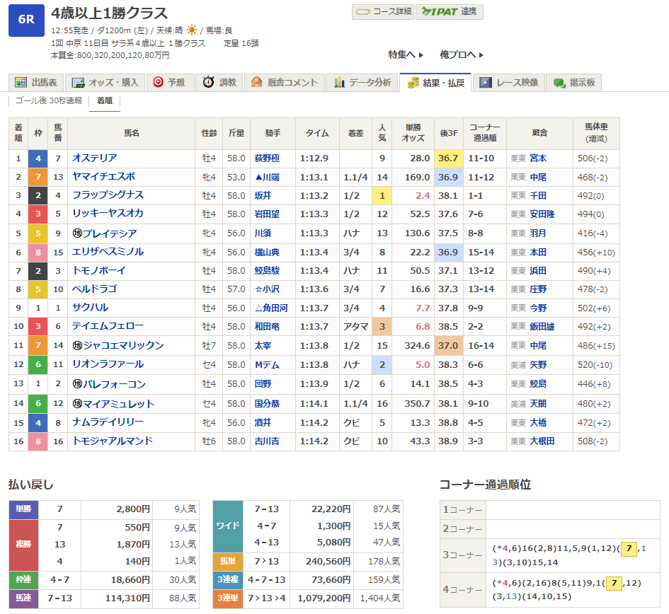 ◎オステリア(9人気)1着 単勝2,800円、複勝550円