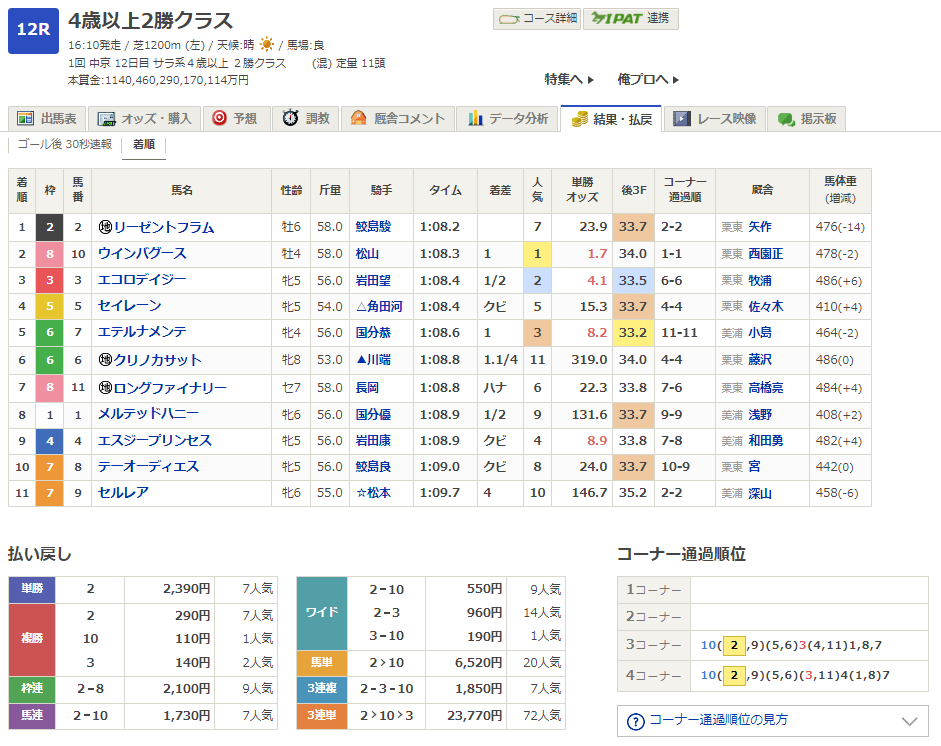 ◎リーゼントフラム(7人気)1着 単勝2,390円、複勝290円