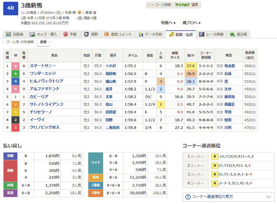 ◎スマートサニー(6人気)1着 単勝1,830円、複勝520円