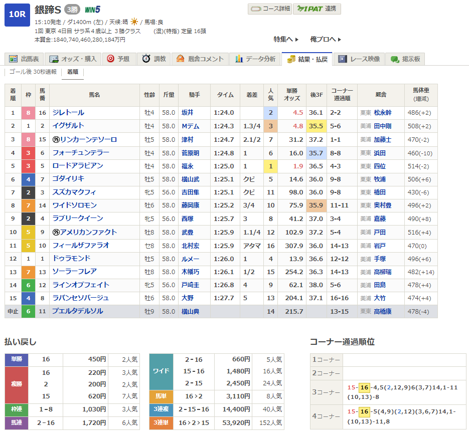 ◎キリンジ(5人気)1着 単勝1,540円、複勝480円