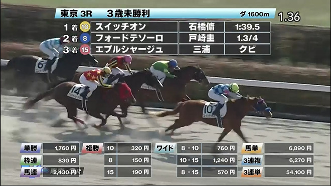 ◎スイッチオン(6人気)1着 単勝1,760円、複勝320円