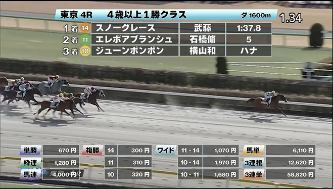◎スノーグレース(3人気)1着 単勝670円、複勝300円