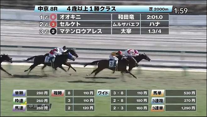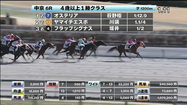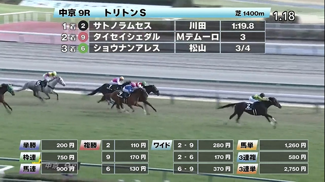 ◎オステリア(9人気)1着 単勝2,800円、複勝550円 - 2/4【中京9R】トリトンステークス