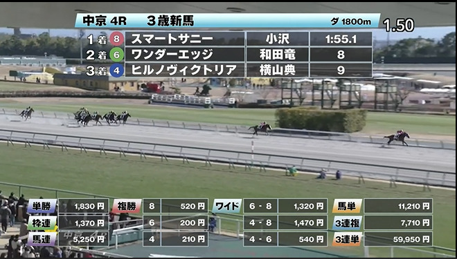 ◎スマートサニー(6人気)1着 単勝1,830円、複勝520円