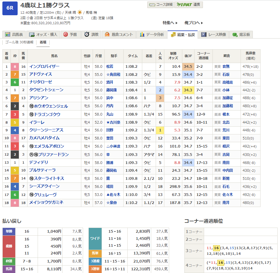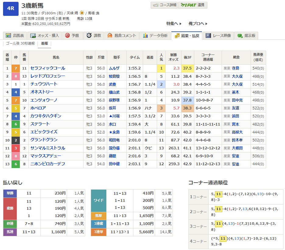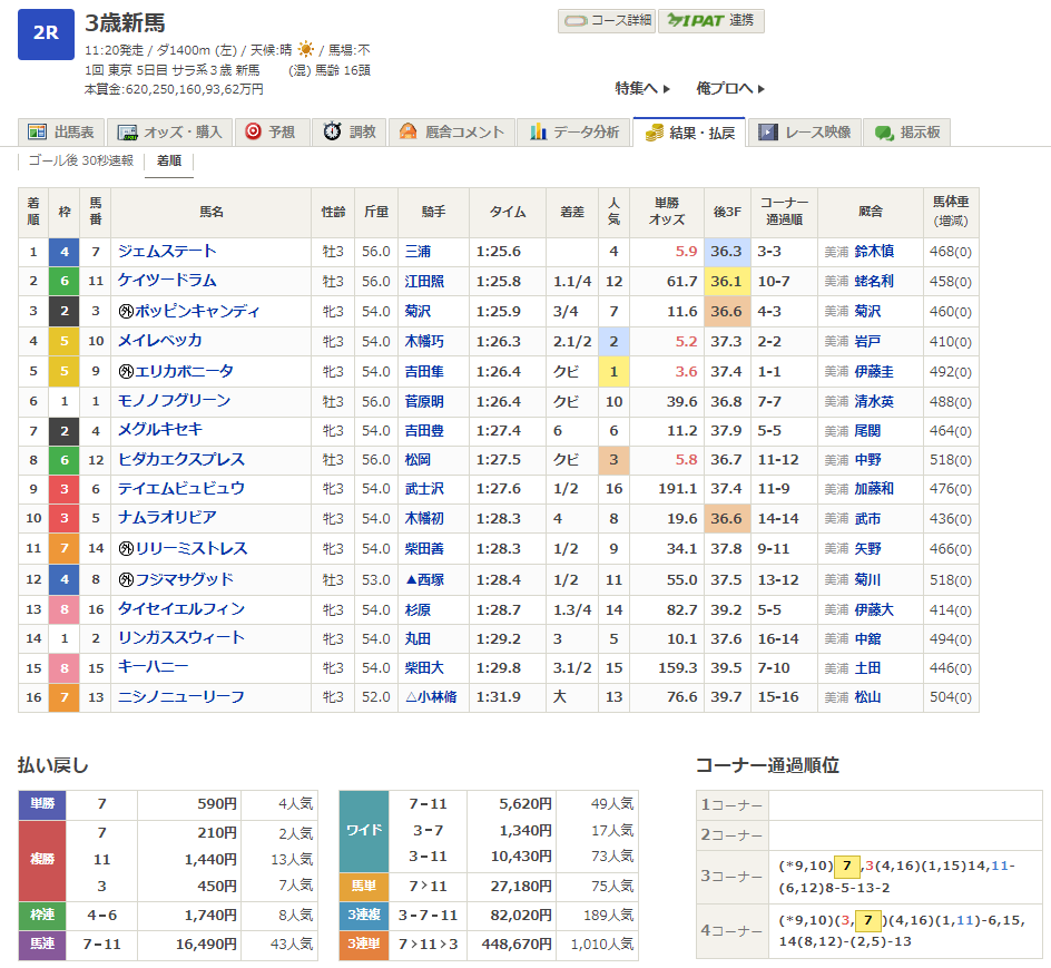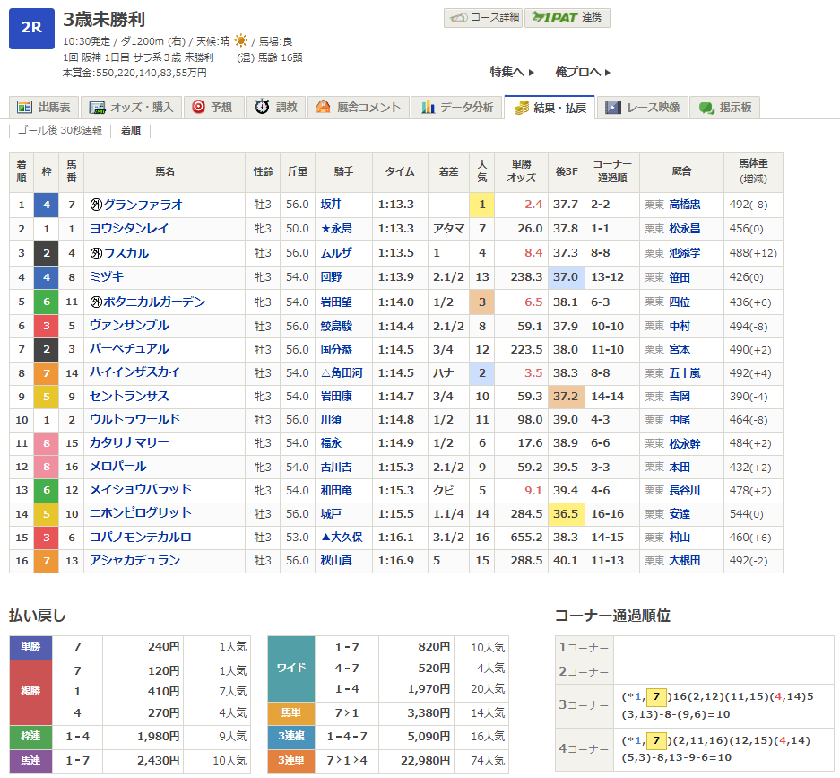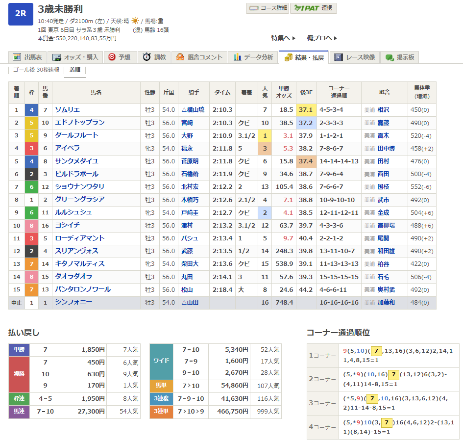 ◎ソムリエ(7人気)1着 単勝1,850円、複勝450円