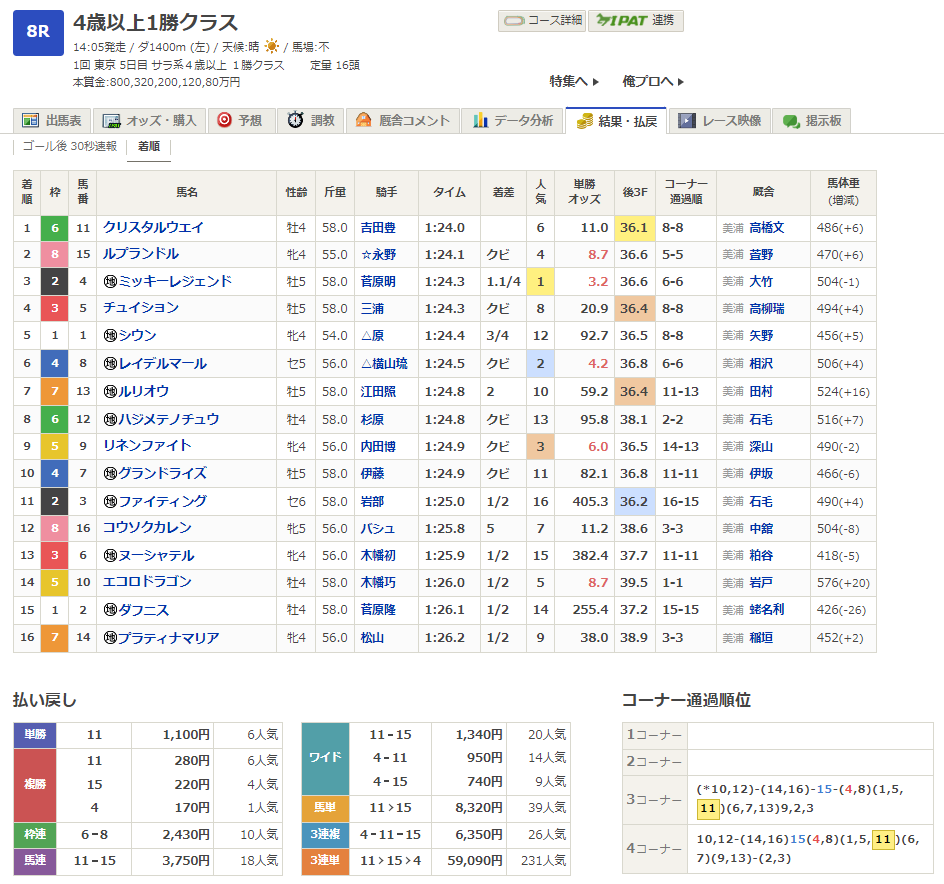 ◎クリスタルウエイ(6人気)1着 単勝1,100円、複勝280円 - 2/11【東京12R】4歳以上2勝クラス