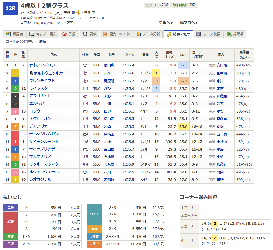 ◎サトノアポロン(6人気)1着 単勝990円、複勝270円
