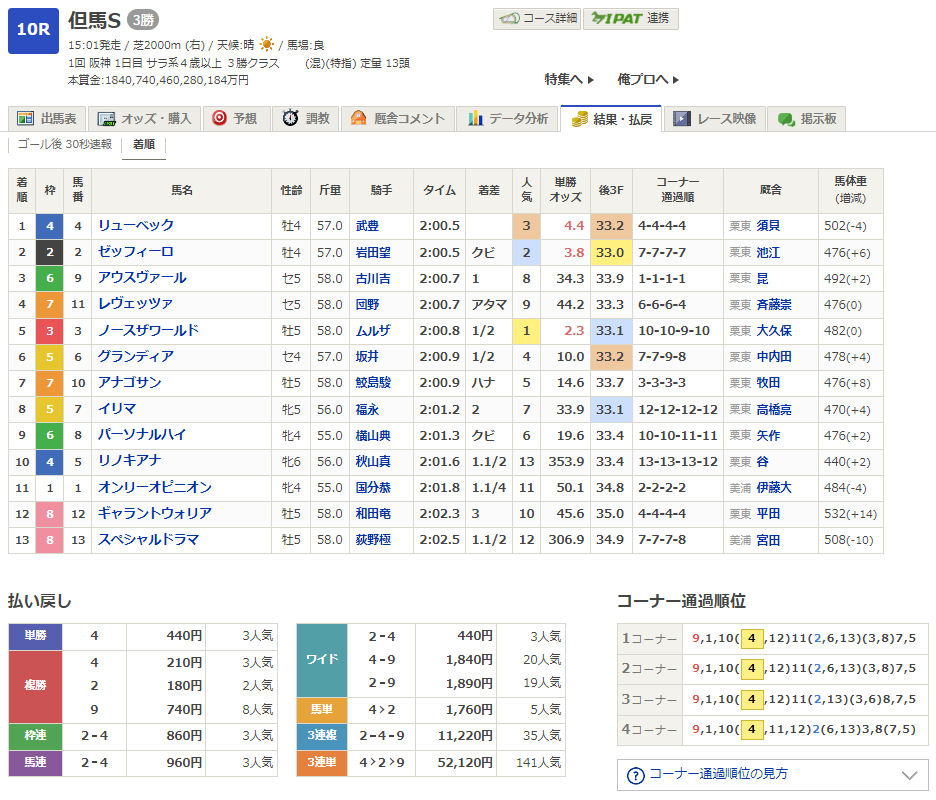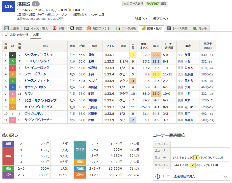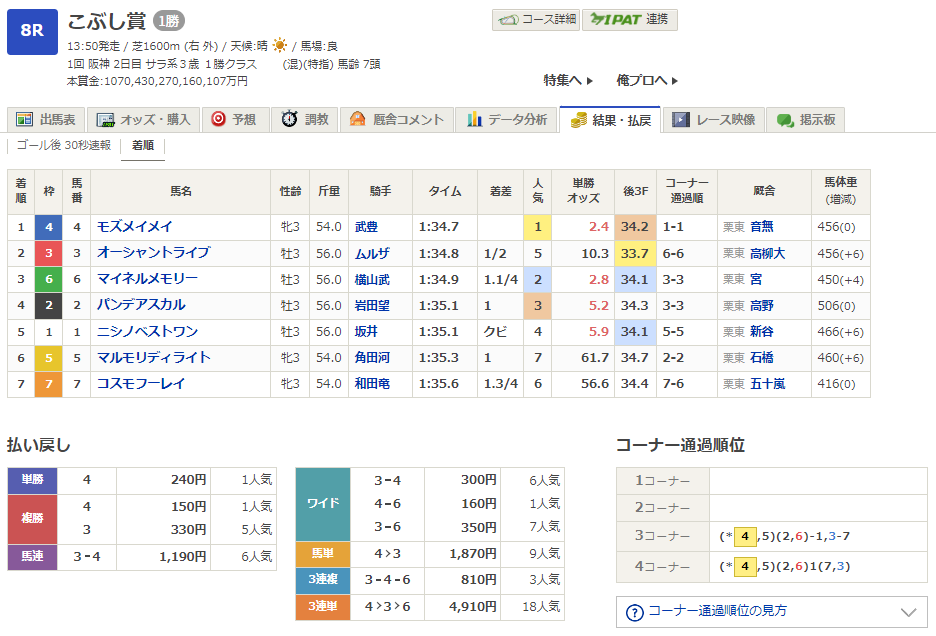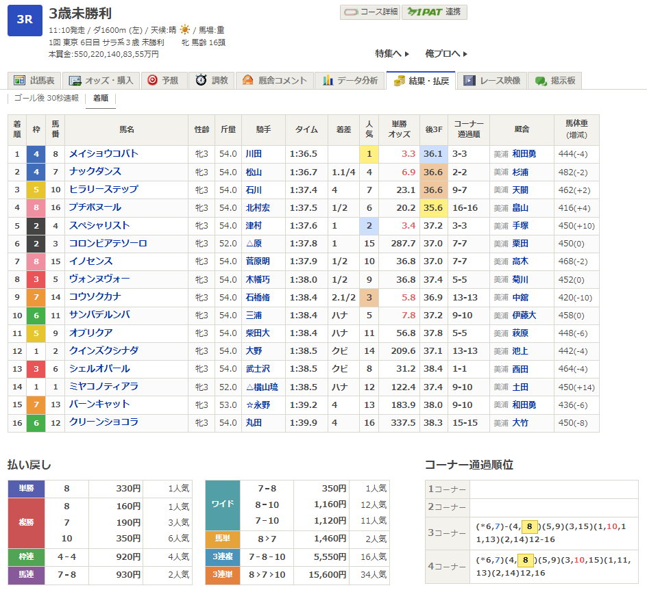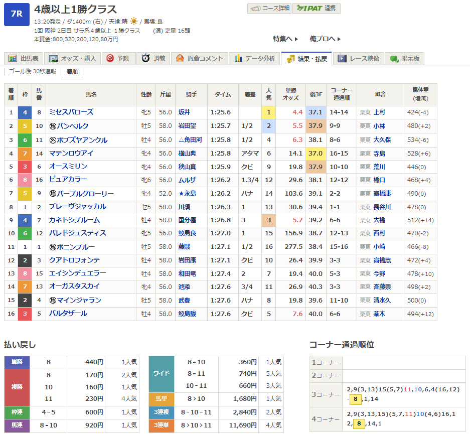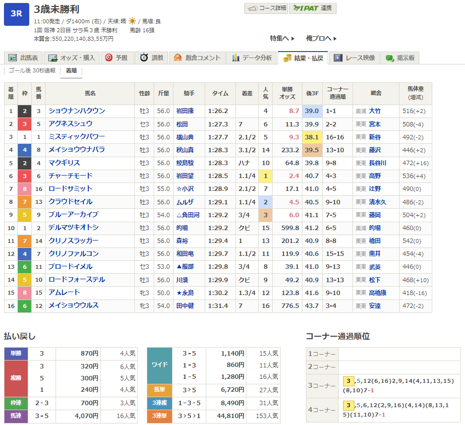 ◎ショウナンハクウン(4人気)1着 単勝870円、複勝320円