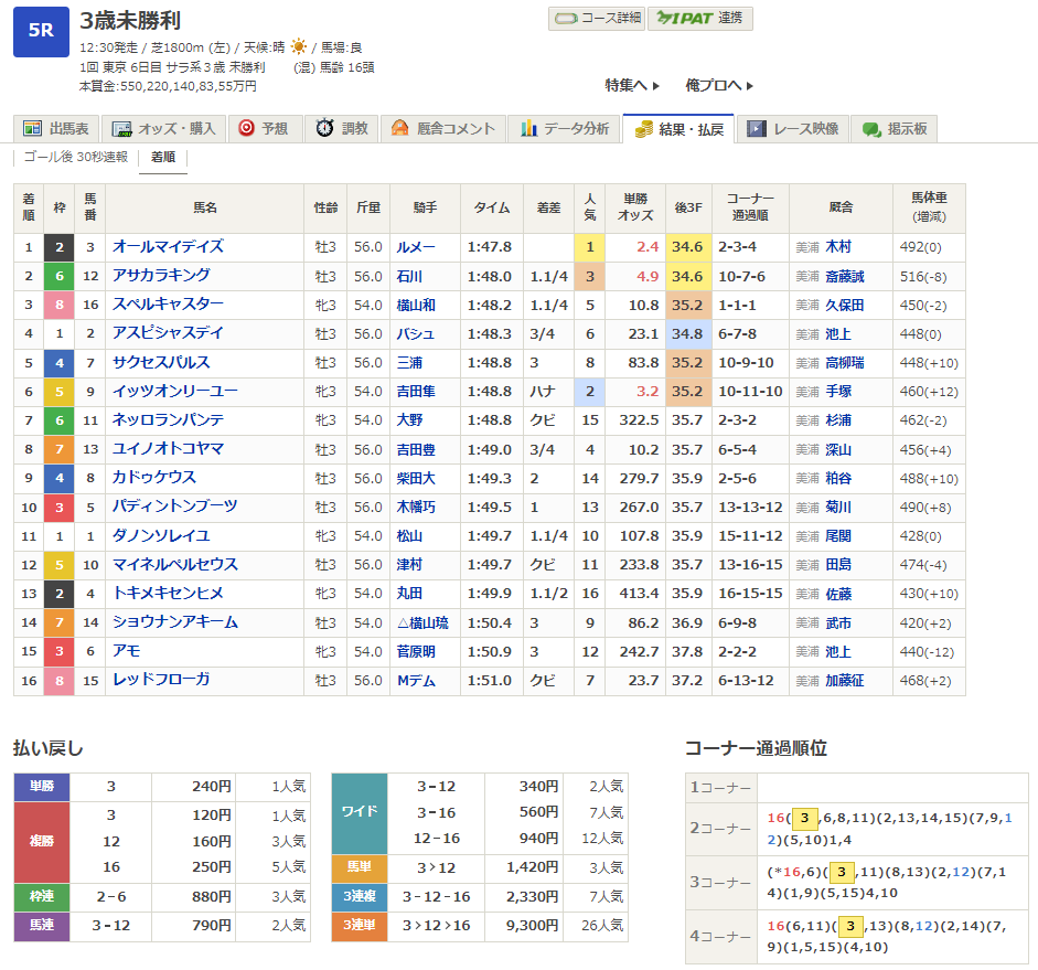 ◎ダイシンカタナ(5人気)2着 複勝480円 - 2/4【東京3R】3歳未勝利