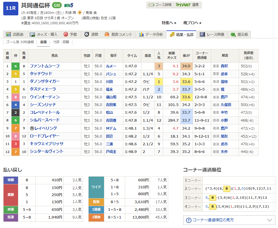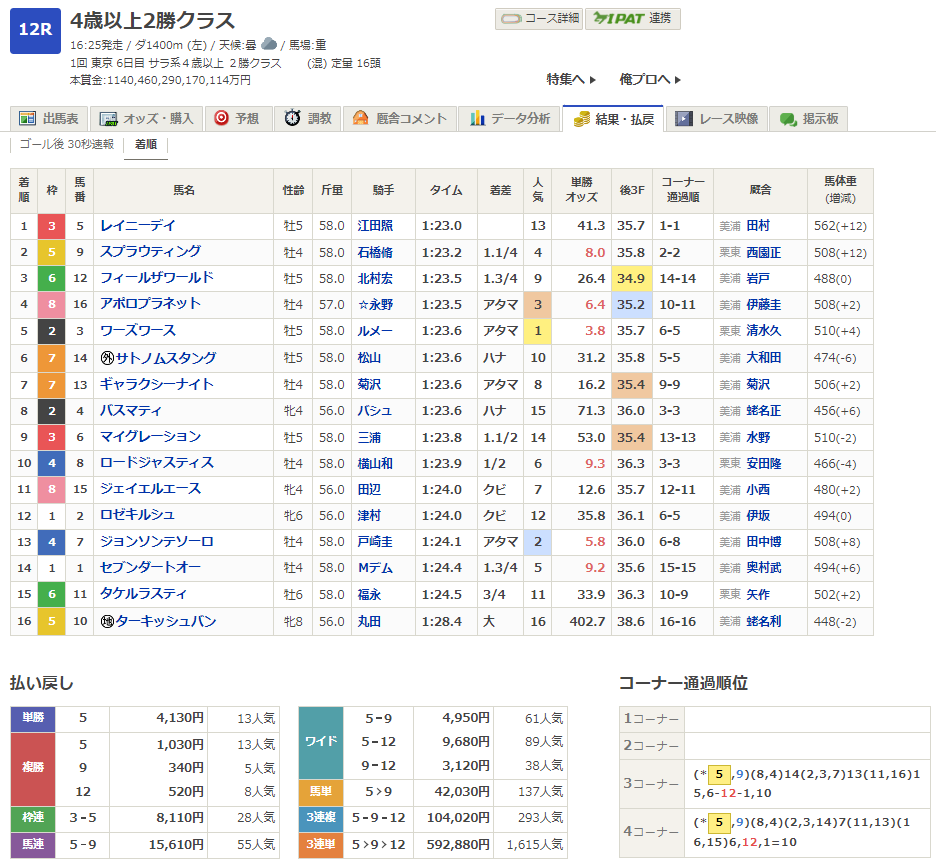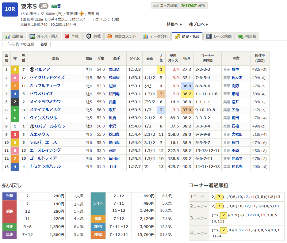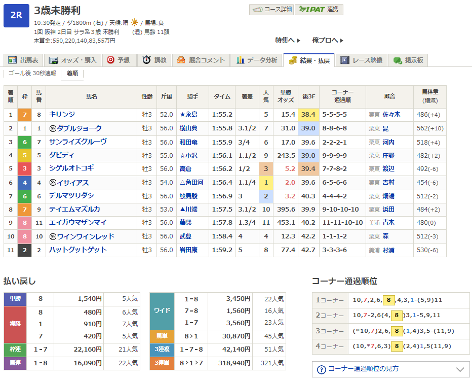 ◎キリンジ(5人気)1着 単勝1,540円、複勝480円