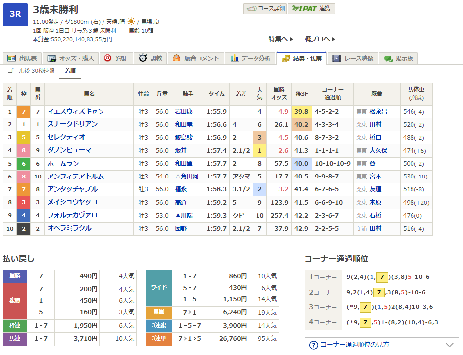 ◎イエスウィズキャン(4人気)1着 単勝490円、複勝200円 - 2/11【阪神6R】3歳1勝クラス