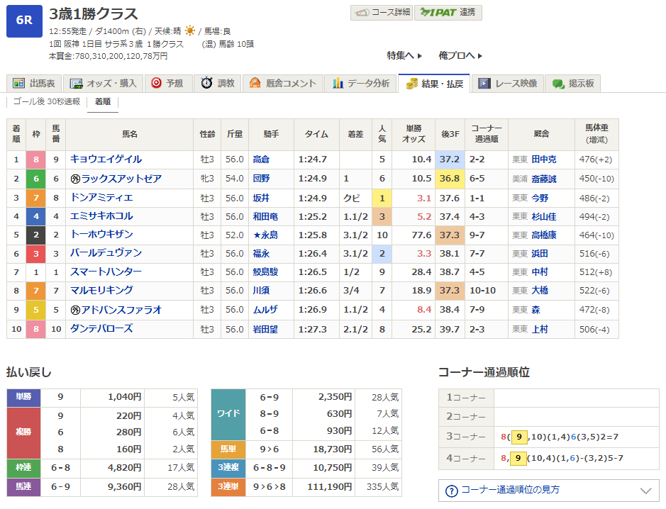 ◎キョウエイゲイル(5人気)1着 単勝1,040円、複勝220円 - 2/11【阪神7R】4歳以上1勝クラス