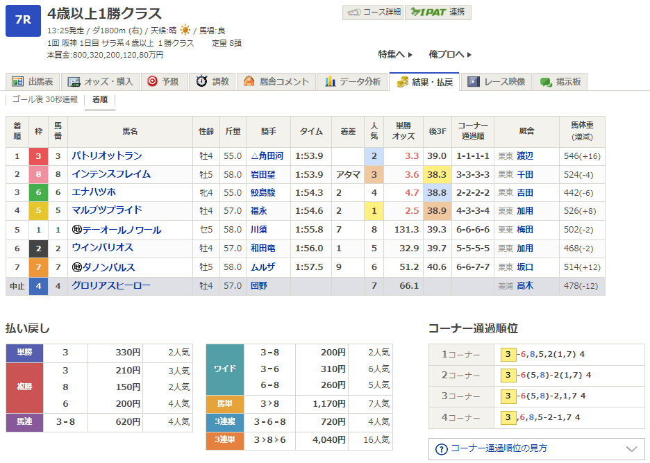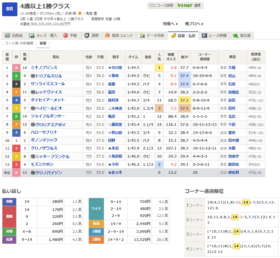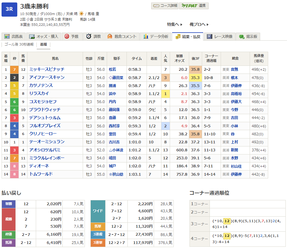 ◎ミッキースピナッチ(7人気)1着 単勝2,020円、複勝620円