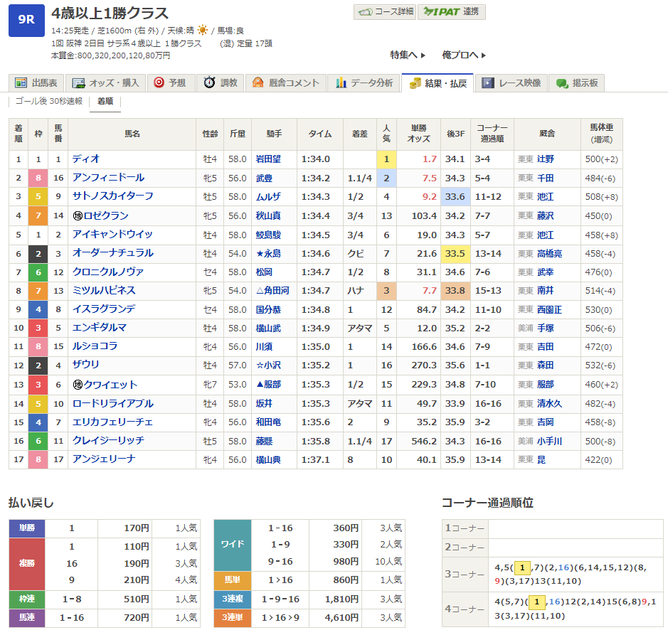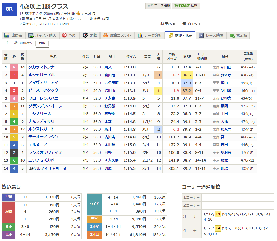 ◎オステリア(9人気)1着 単勝2,800円、複勝550円 - 2/4【中京9R】トリトンステークス