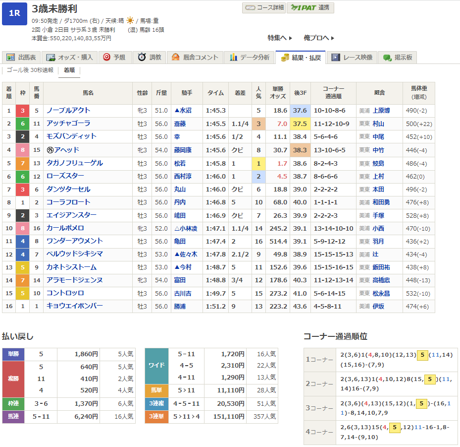 ◎ノーブルアクト(5人気)1着 単勝1,860円、複勝640円 - 2/12【小倉2R】3歳未勝利