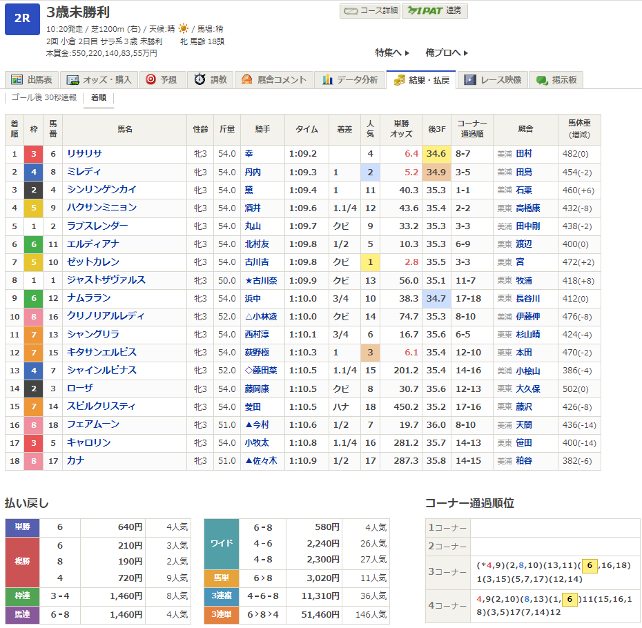 ◎ヘネラルカレーラ(4人気)2着 複勝330円 - 2/4【小倉3R】3歳未勝利