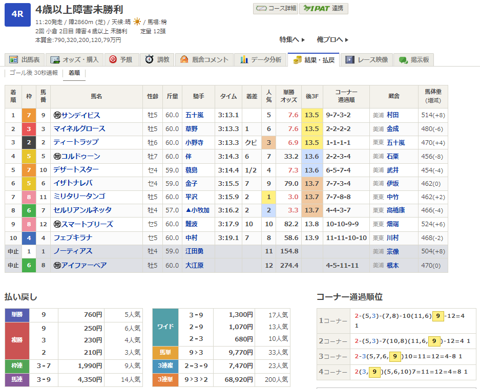 ◎デルマシルフ(5人気)1着 単勝1,150円、複勝310円 - 2/5【小倉4R】4歳以上障害未勝利