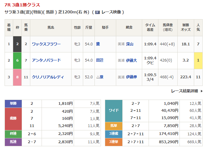◎ワックスフラワー(7人気)1着 単勝1,810円、複勝420円