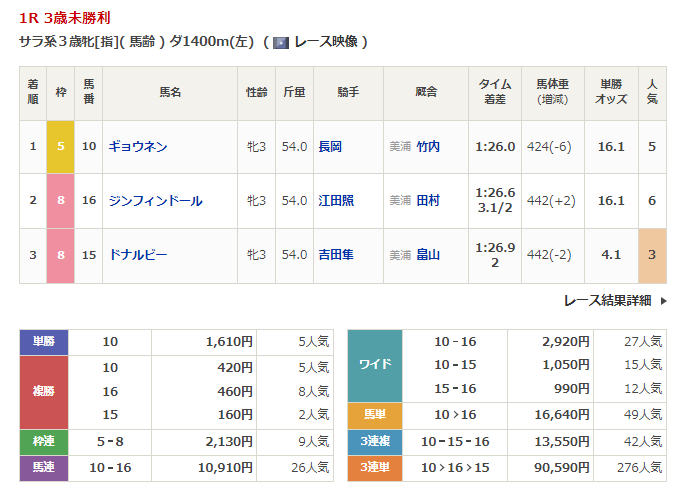 ◎ジンフィンドール(6人気)2着 複勝460円