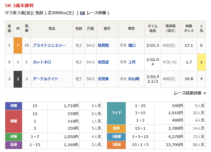 ◎ブライトジュエリー(6人気)1着 単勝1,710円、複勝370円