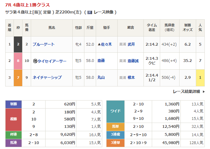 ◎ブルーゲート(5人気)1着 単勝620円、複勝180円