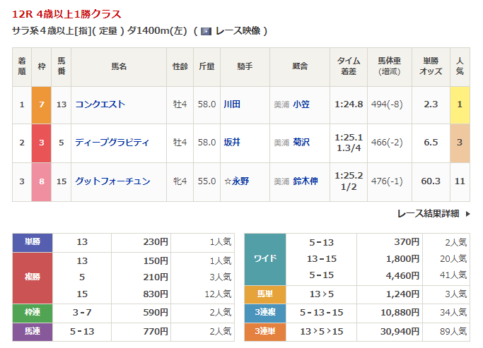 ◎デザートスター(4人気)3着 複勝180円