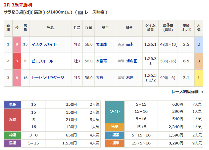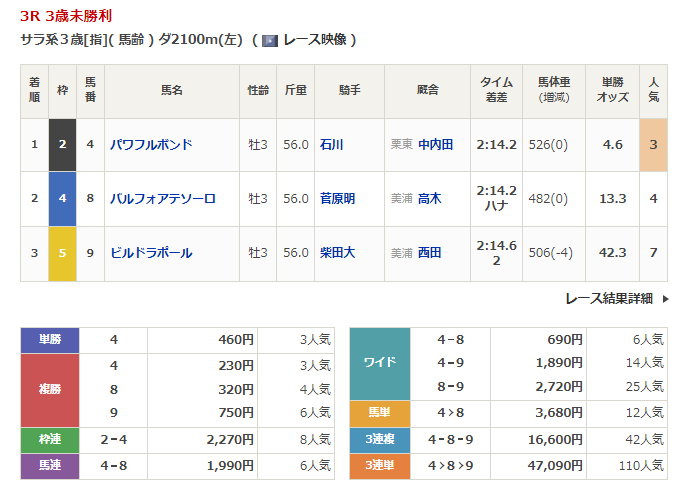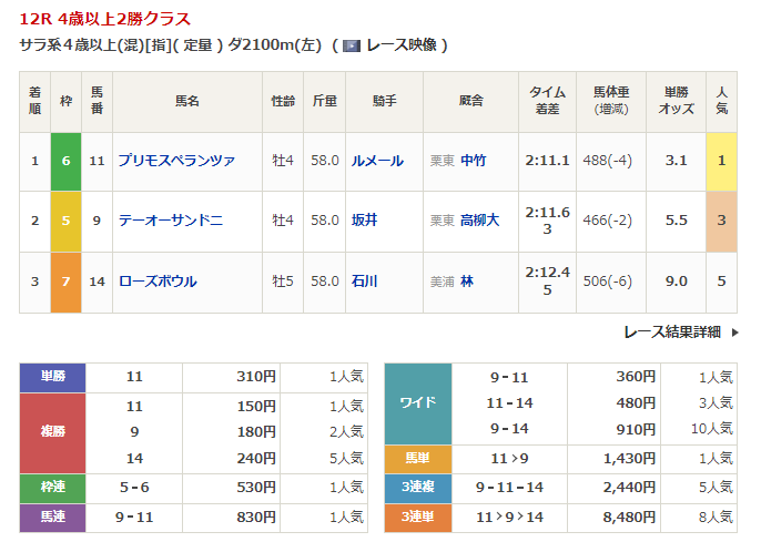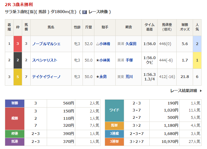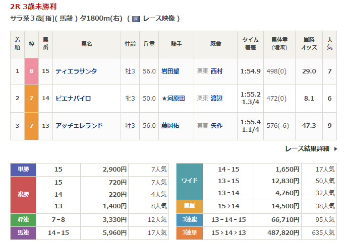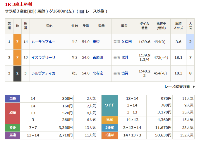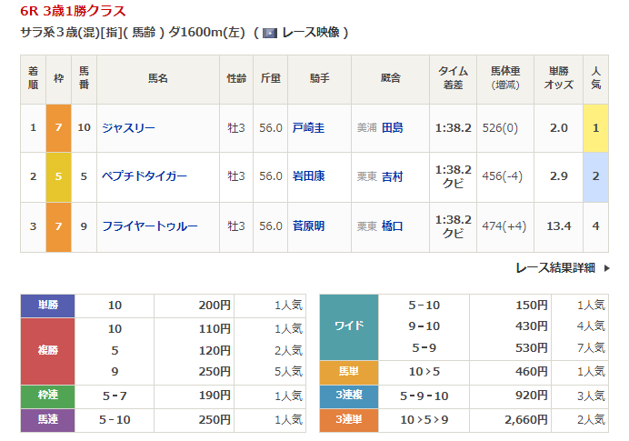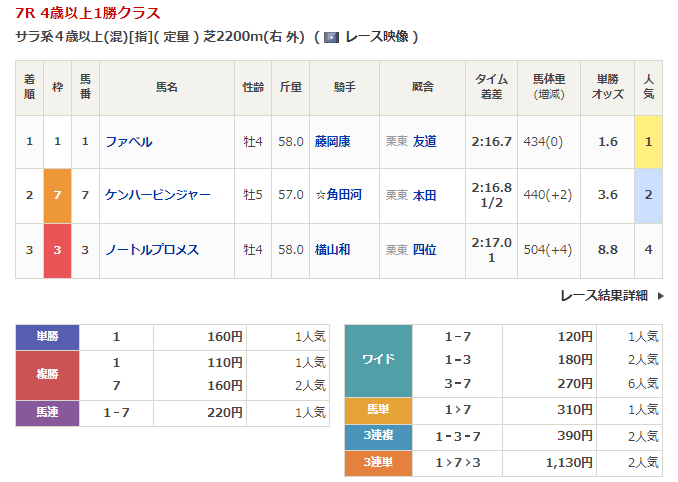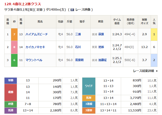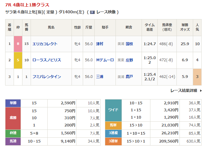 ◎ウイニングライブ(7人気)1着 単勝1,690円、複勝390円