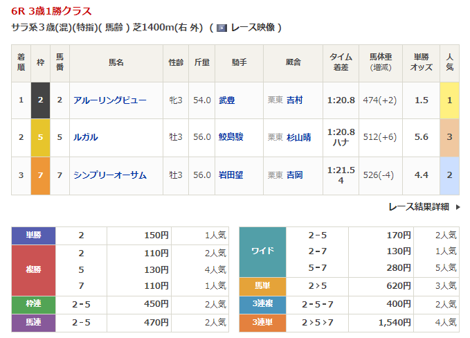 ◎ルミネイト(1人気)1着 単勝380円、複勝150円