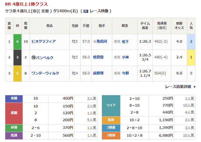 ◎ケイツーユーロ(8人気)3着 複勝410円