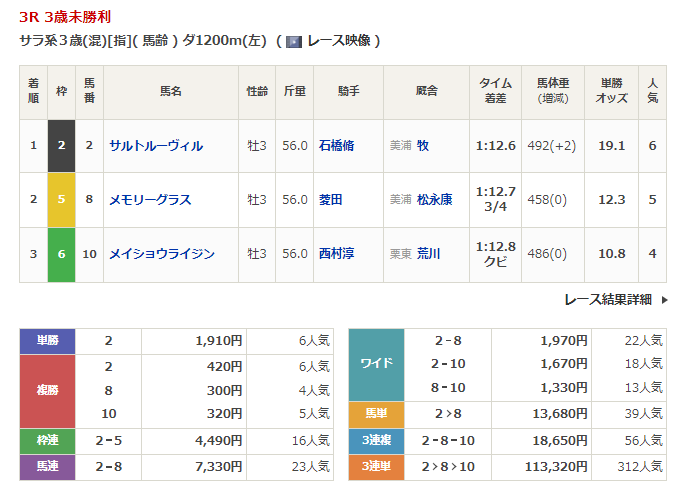 ◎サルトルーヴィル(6人気)1着 単勝1,910円、複勝420円